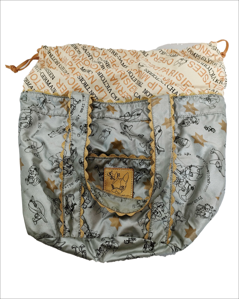 可愛い飛行機&犬の総柄が特徴で、シルバー×ゴールドの上品な色合いが大人の遊び心を演出。