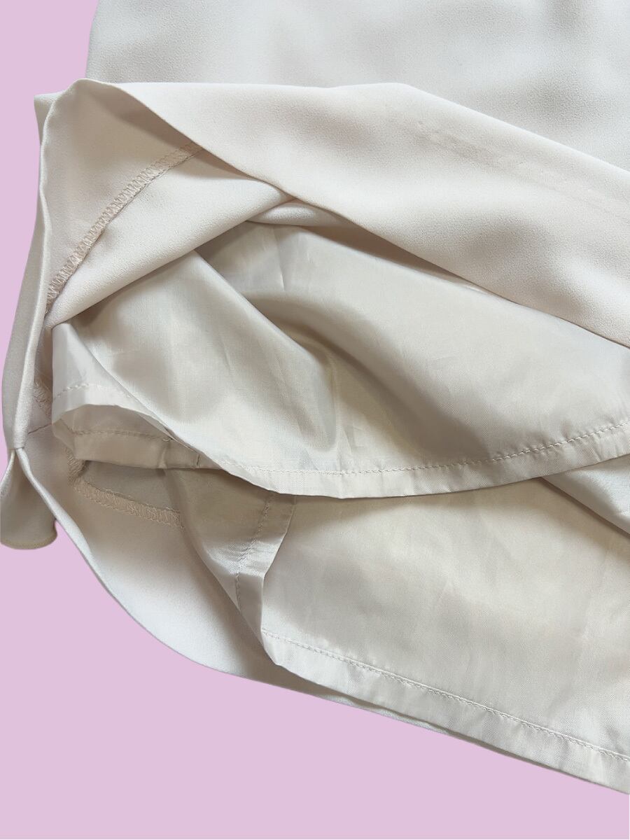 クリームホワイトにサイドフリルが映えて、歩くたびふわっと軽やか。